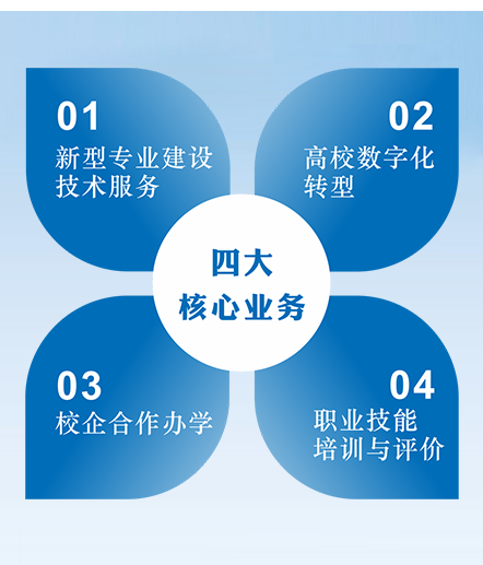 公司秉承“产教融合、校企合作、工学结合、知行合一”的教育理念,高擎“匠心铸教”的旗帜,为广大院校提供新型专业建设技术服务、高校数字化转型、校企合作办学和职业技能培训与评价等服务。